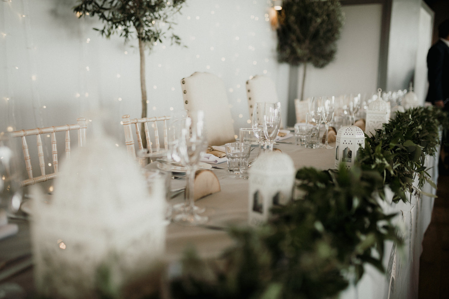 A naturalistic backdrop of foliage framed the reception space at Chalk Barn. It’s such a beautifully finished venue that simplicity carries through well and allows the space to photograph to its maximum potential. We used seasonal foliage throughout the space including olive leaf, ferns, eucalyptus and ruscus threads.