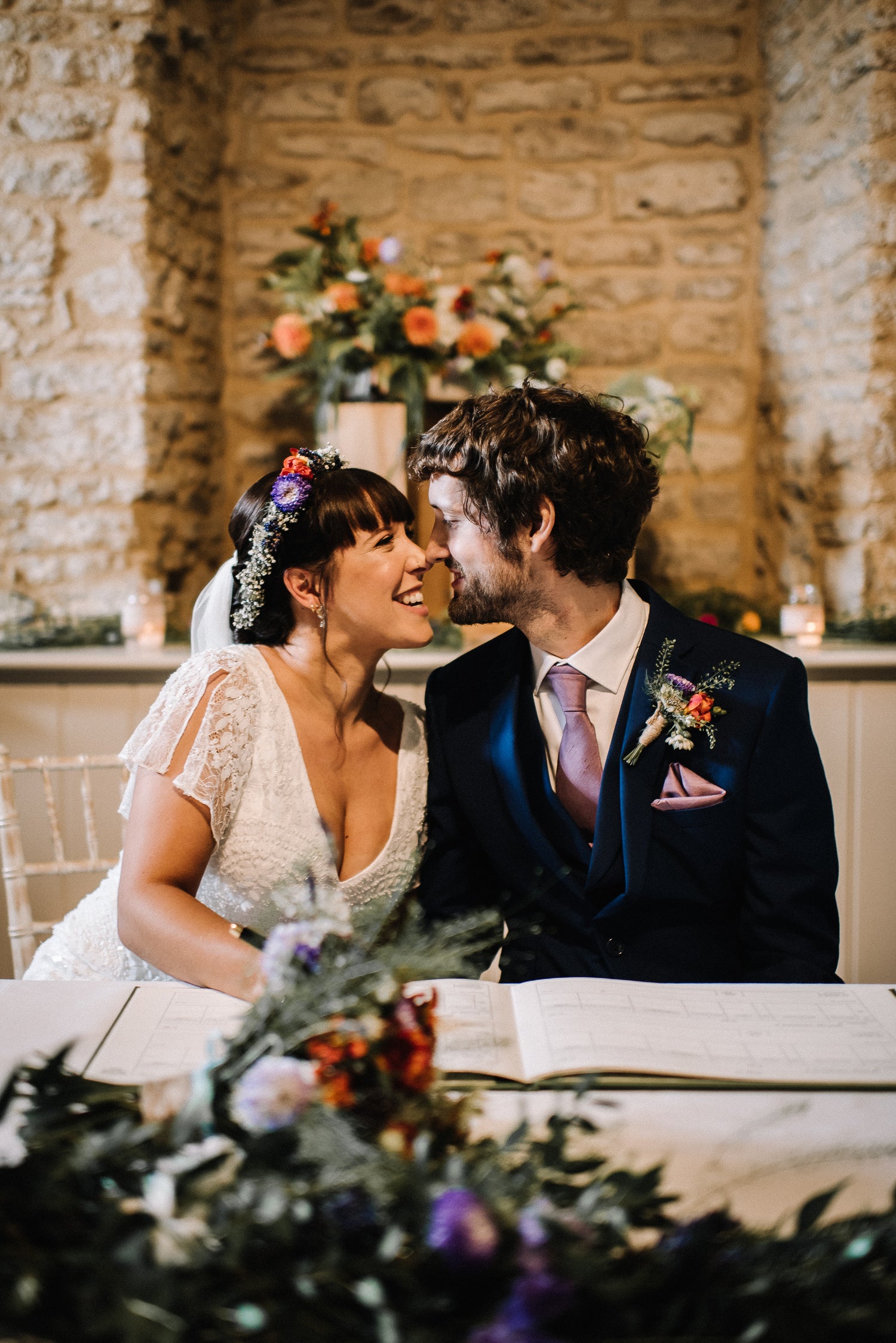 Wick Farm is a stunning venue with so many rustic features. It was fun to highlight them with a bright and bold colour way celebrating purples, oranges, whites and blush. We framed the space with tumbling seasonal foliage all sourced locally in the South West. It was such a dramatic and beautiful setup that we featured in Your Bristol and Somerset Wedding Magazine. All pictures were taken by the amazing talented Sheryl, also known as Oobaloos