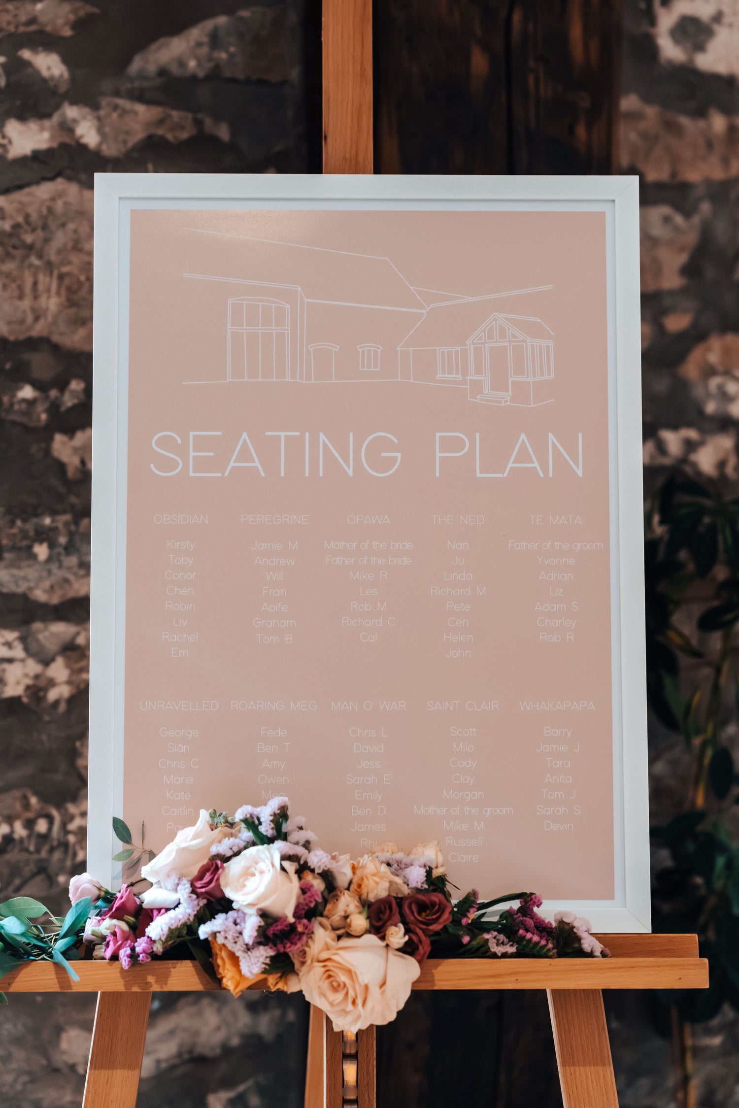 We repeated the colourway throughout the mill. The beautiful architectural features were highlighted with floral gestures such as this sign flourish. The flowers were carefully conditioned with minimal wiring to ensure they could last out of water.