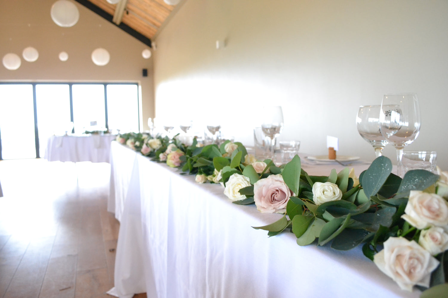 The venue was filled to the brim with blooms but one highlight was definitely this floral runner to complete the top table. We completed this on the day for the most fresh look, it really was elegant luxe! Populous eucalyptus, punctuated with luxury roses and lisianthus. Quicksand roses taking centre stage.