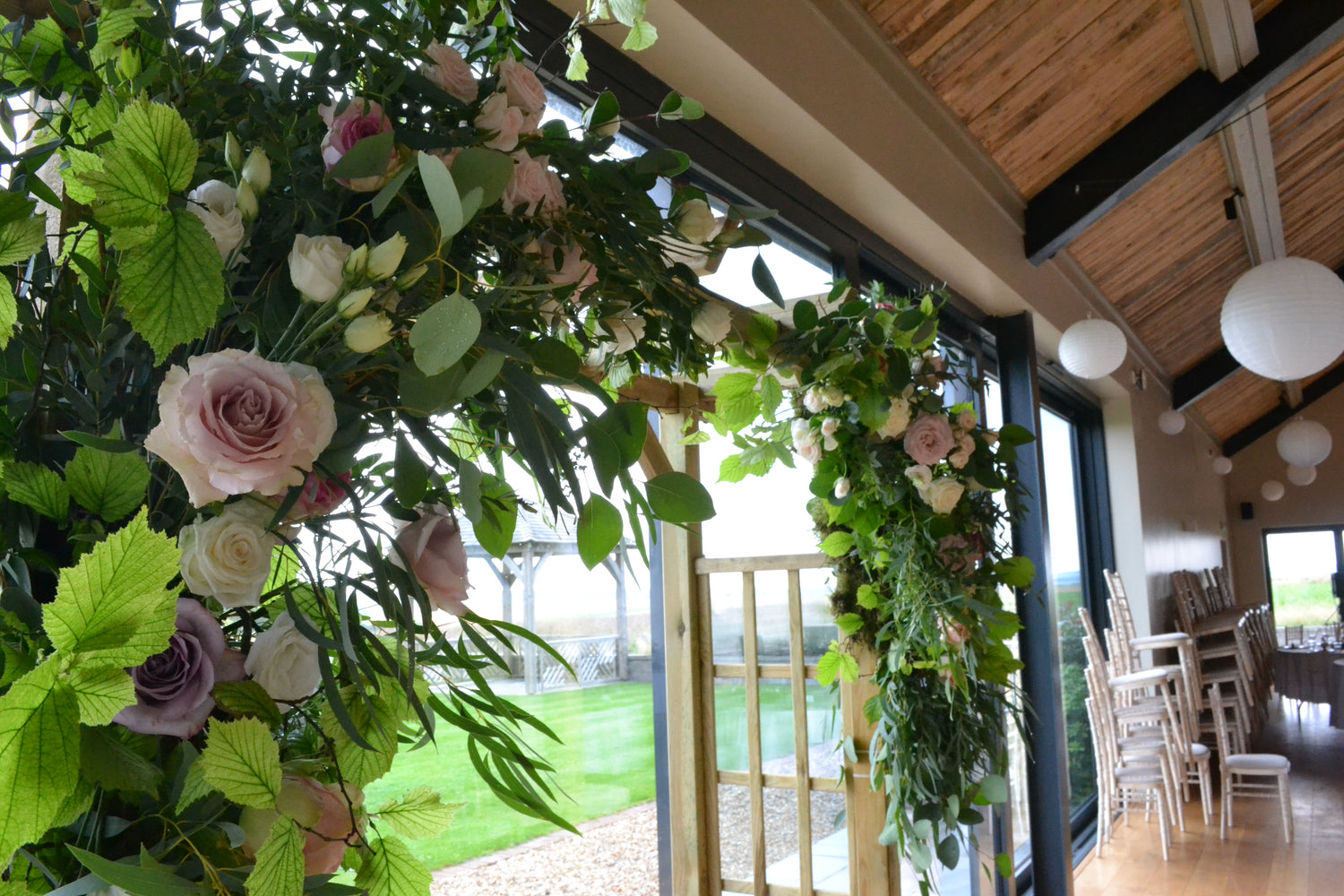 Sometimes you need to go big. We had a lot of fun creating this bespoke installation for the couple, fixed on to a wooden arch. Cascades of roses, eucalyptus and beech framed the space and filled the room with beautiful scent.
