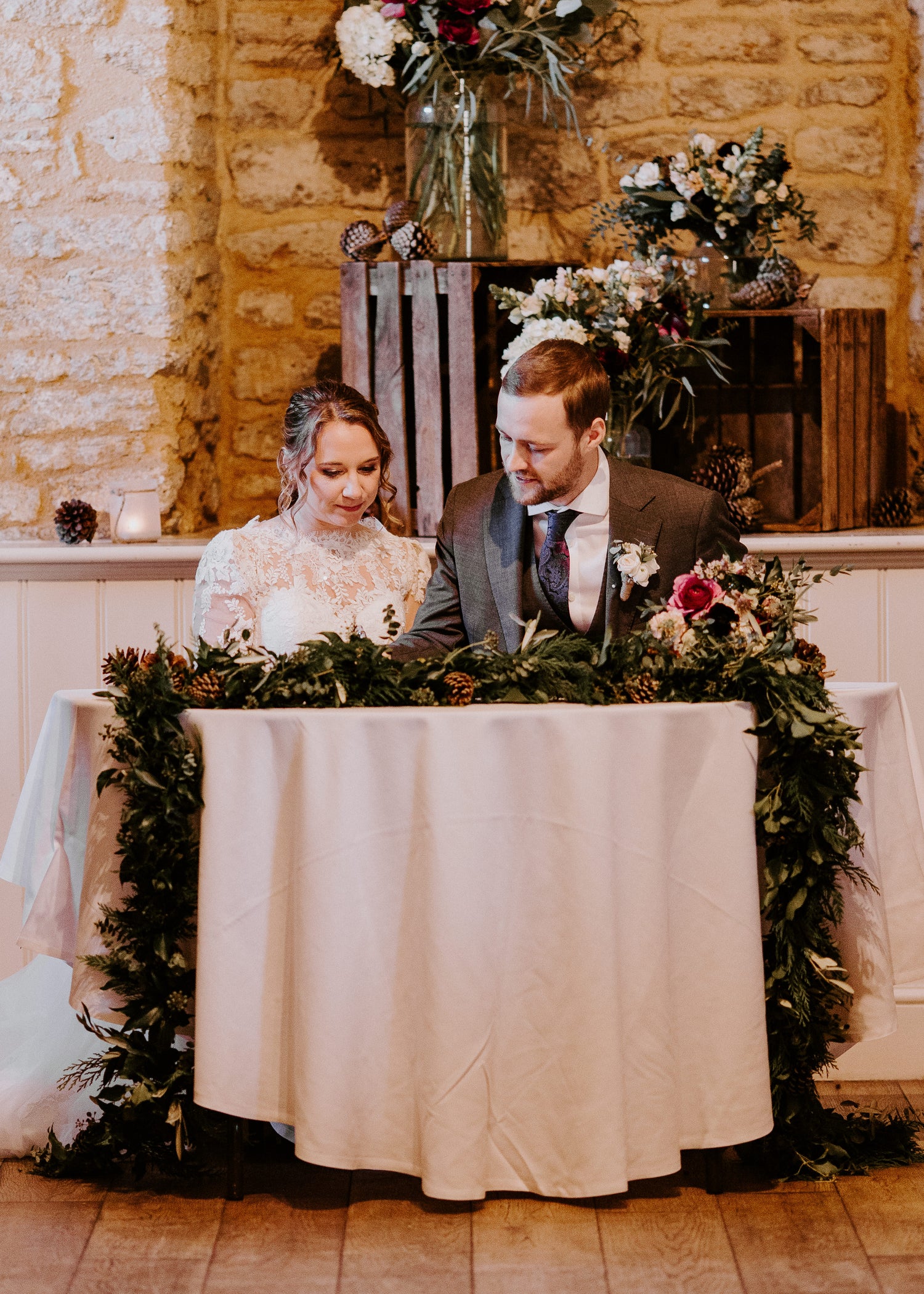 We completed the look with a tumbling foliage runner which was later re-purposed on the top table as a circlet. Large pinecones punctuated the look throughout many of which were foraged by the couple themselves!